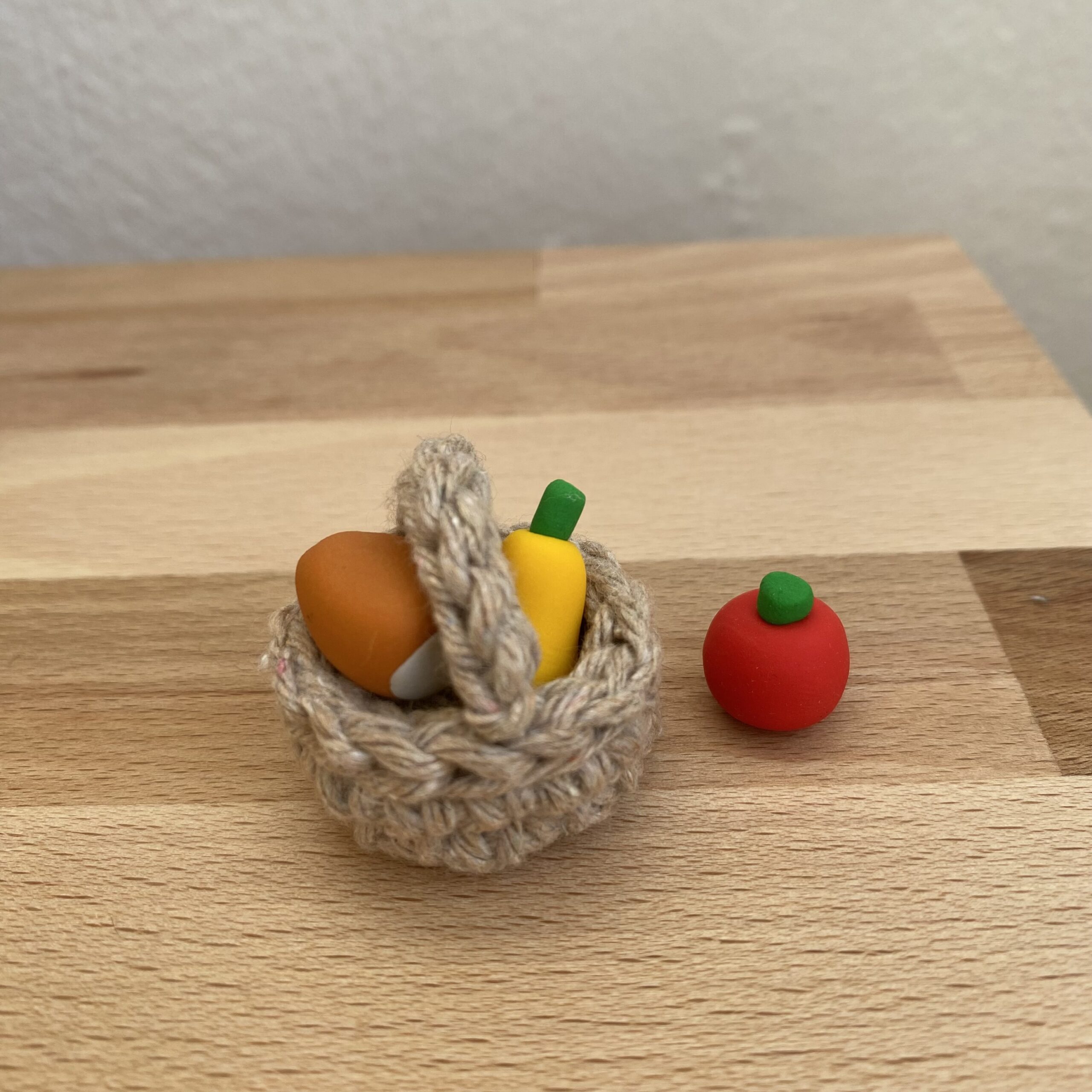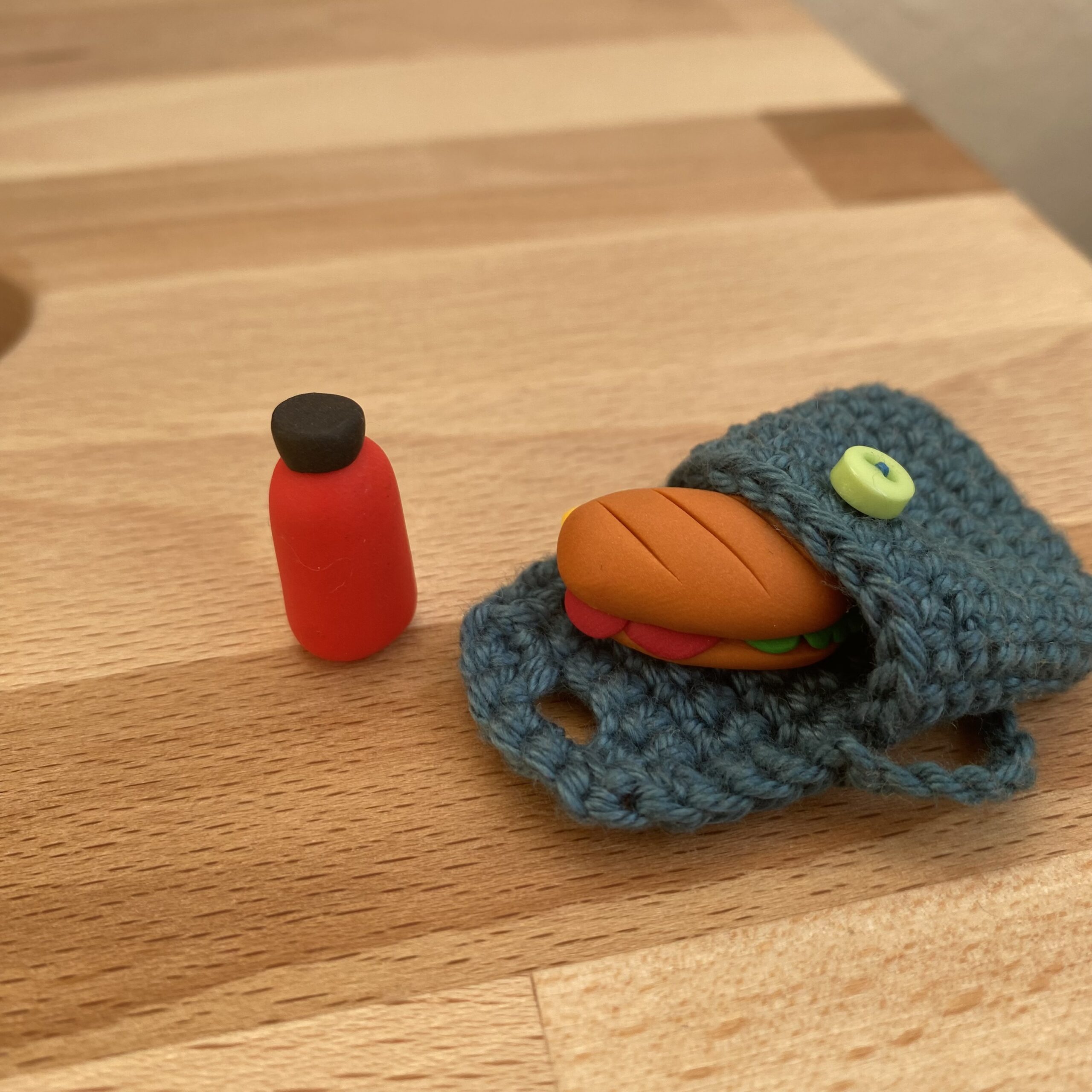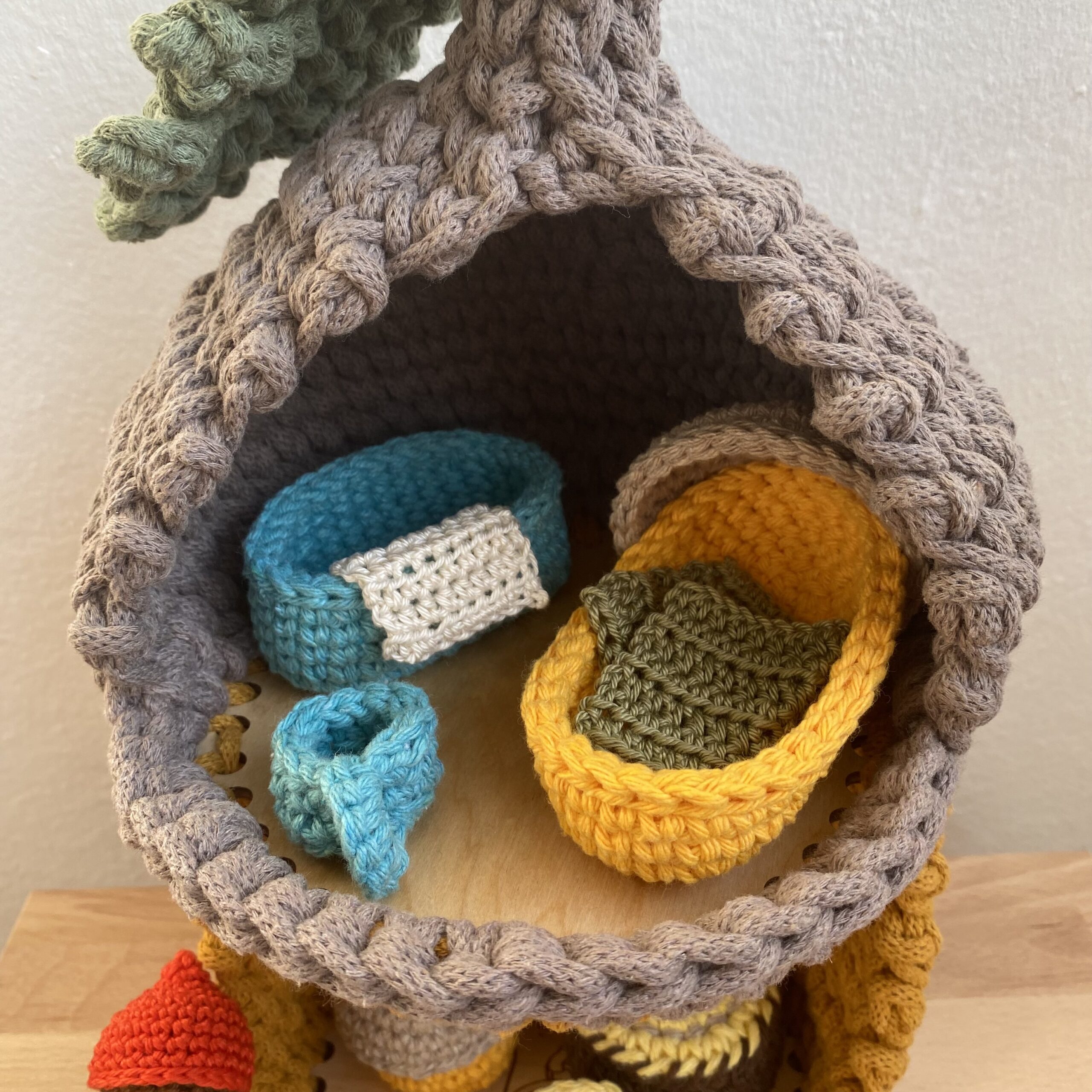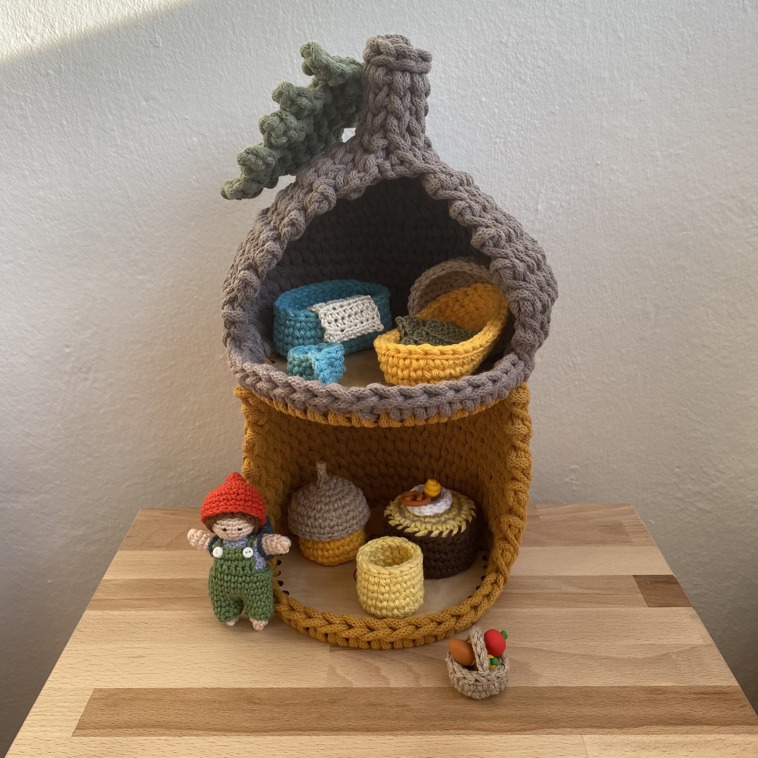 Olyan természetes anyagokból áll, mint a fa és a pamutfonalak. 90%-ban újrahasznosított fonalakat használok fel benne. Csupán a legkisebb kiegészítőket készítem süthető gyurmából.