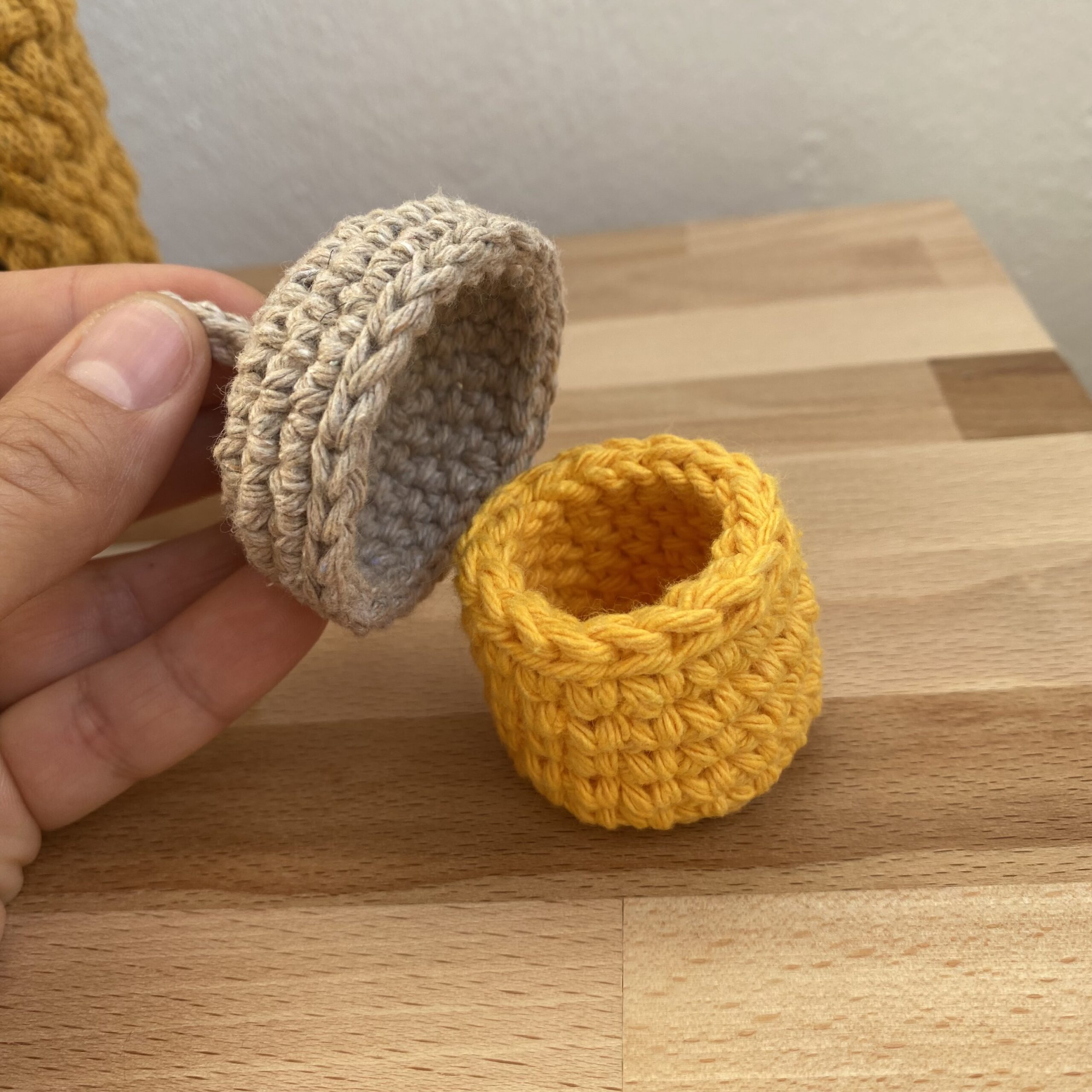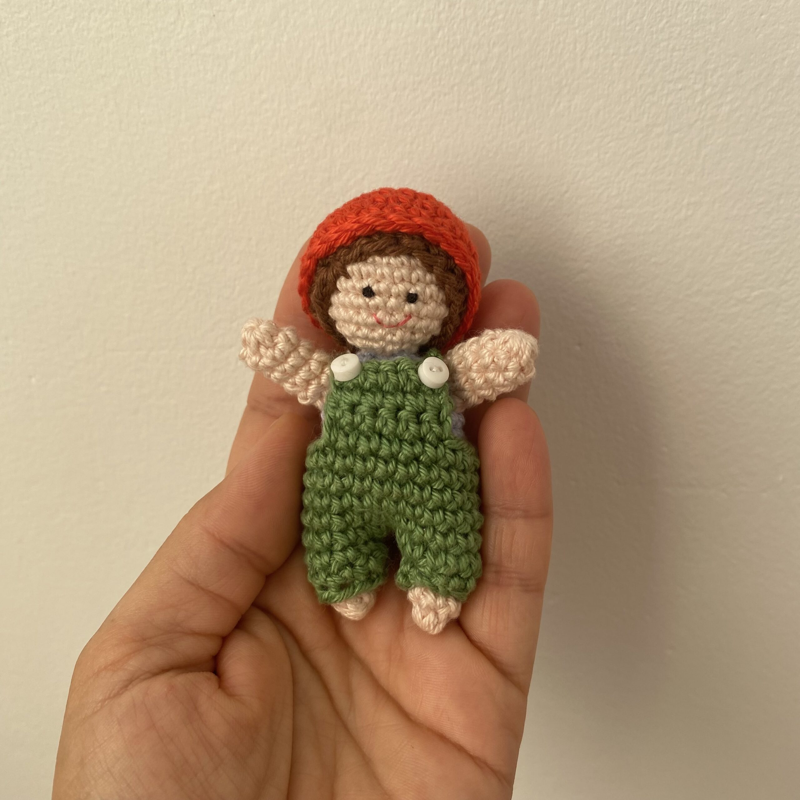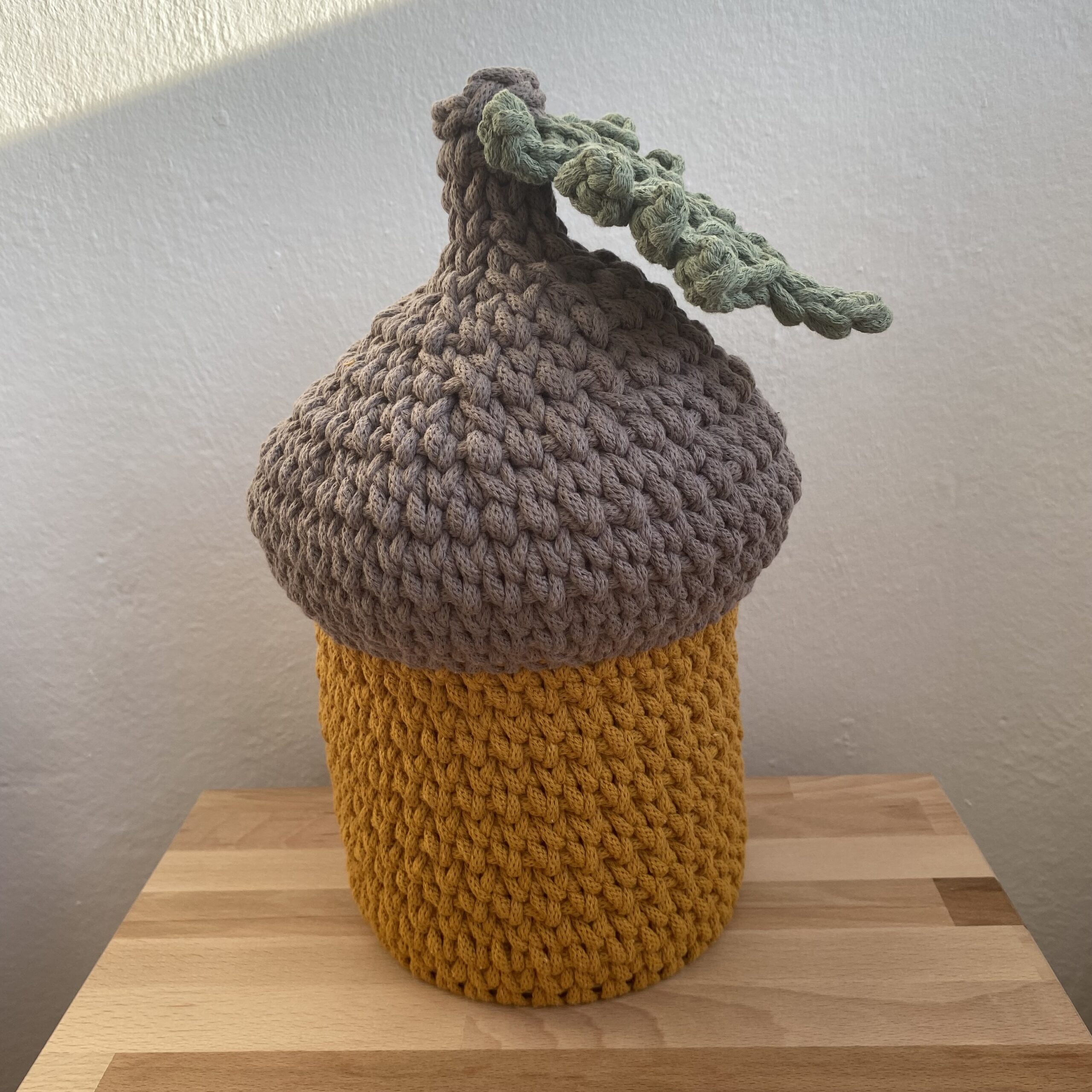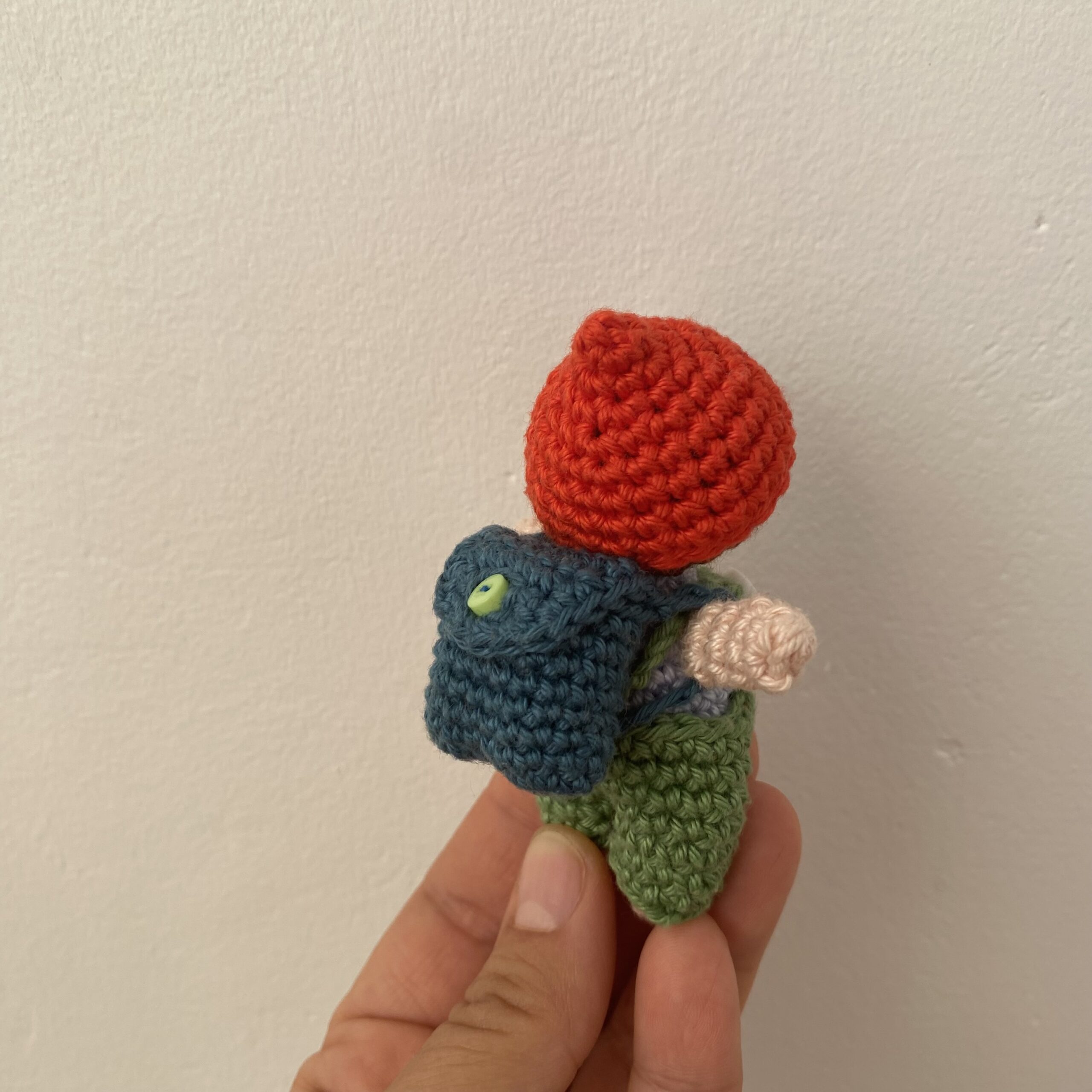 Olyan természetes anyagokból áll, mint a fa és a pamutfonalak. 90%-ban újrahasznosított fonalakat használok fel benne. Csupán a legkisebb kiegészítőket készítem süthető gyurmából.